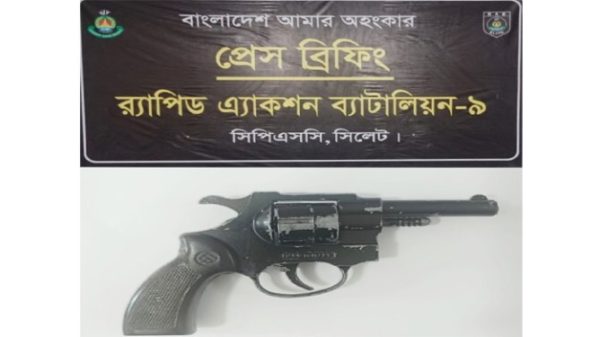 সিলেট প্রতিনিধি: সিলেটের ওসমানীনগর উপজেলায় র্যাব-৯ এর অভিযানে একটি বিদেশি রিভলবার উদ্ধার করা হয়েছে। র্যাব-৯ সূত্র জানায়, মঙ্গলবার (১৭ ফেব্রুয়ারী) রাত আনুমানিক ১০টা ১৫ মিনিটে র্যাব-৯, সিপিসি-১, সিলেটের একটি আভিযানিক দল গোপন সংবাদের ভিত্তিতে ওসমানীনগর উপজেলার তাজপুর ইউনিয়নের পূর্ব রোকনপুর এলাকায় বিশেষ অভিযান পরিচালনা করে। অভিযানকালে রোকনপুর এলাকার একটি পুকুরের আশপাশে ব্যাপক তল্লাশি চালানো হয়।একপর্যায়ে