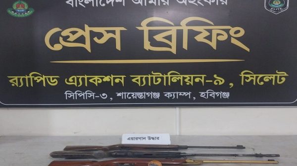 হবিগঞ্জ প্রতিনিধি: হবিগঞ্জের চুনারুঘাট উপজেলায় র্যাব-৯ এর বিশেষ অভিযানে পরিত্যক্ত অবস্থায় ৩টি এয়ারগান ও ৫১ রাউন্ড এয়ারগানের গুলি উদ্ধার করা হয়েছে। র্যাব-৯ সূত্র জানায়, মঙ্গলবার (১০ ফেব্রুয়ারী) রাত আনুমানিক ৩টা ১০ মিনিটে র্যাব-৯, শায়েস্তাগঞ্জ ক্যাম্পের একটি দল হবিগঞ্জ জেলার চুনারুঘাট থানাধীন দেওয়ানহাট ইউনিয়নের বলিয়ারী গ্রামে একটি ইটভাটার পাশে অভিযান চালায়।অভিযানকালে একটি প্লাস্টিকের বস্তা থেকে পরিত্যক্ত