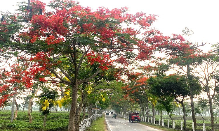 শ্রীমঙ্গলে পথচারীদের চোখ জুড়াচ্ছে সারি সারি কৃষ্ণচূড়া